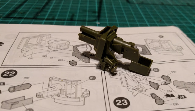 Telaketjujen jälkeen pääsin vihdoin uniikin päätykkitornin kimppuun. Rakennusjärjestys oli taas vähän jännä, ensin piti rakentaa tornin ulkoreunat, sitten siirryttiin tykin kehdon kasaamiseen. Tornin sisäpuolelle jäi aika hyvin yksityiskohtia, jos tämän tornin olisi rakentamassa luukut auki. Tai sitten, jos olisi sellainen olo, päätornin voisi maalata sisältä ja irroittaa vaunusta ihasteltavaksi. Tosin en ihan uskonut, että malttaisin maalata tämän sisuksia, joten todennäköisesti tämä jäi vain ihan omaksi mietelmäkseni (ja jos joku muu tätä lukiessaan saisi inspiraatiota, hyvä niin).Vaunun päätykki (76.2 mm M27/32) oli aika metkan näköinen ja aika monivaiheinen rakennettavaksi. Teknisesti se(kin) oli ymmärtääkseni typerä idea, mutta alkusodan aikaan vaunujen aseistus ei ollut parhaimmillaan. Kai tuolla jotain saatiin tosimaailmassa hajoitettua, mutta ainakin wikipedian mukaan päätykki korvattiin myöhemmin toisella, hippasen paremmalla vehkeellä.