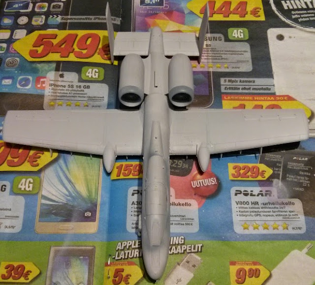 Kävin läpi aikamoisen nivaskan Lasselta saamaani A-10 -referenssimateriaalia: tekstiä ja kuvia. Keskityin pääasiassa tähän nimenomaiseen versioon (joka taas löytyi viitattuna joko "N/AW A-10A" tai "YA-10B" -tunnuksella) ja sen ulkonäköön. Liitän alle kaksi mielestäni hyödyllistä esimerkkikuvaa.Tumma vempele olisi tieni päässä. Tietysti voisi kai olla mahdollista, että näiden kuvien esittämien testilentojen (kt.s mikälie sensoritikku nokassa) jälkeen protokone olisi saanut toisenlaisen maalikaavion päälleen, mutta siitä ei tullut vastaan mainintaa. Päätin pitää päätökseni jättää "mitä jos" -maailman sikseen ja pysyä vakaasti asialinjalla.